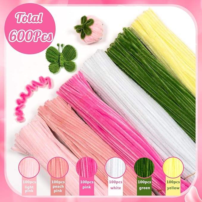 600 Pcs Pink Pipe Cleaners Craft for Flowers, Pastel Chenille Stems for DIY Art Projects Creative Gift(6 Colors)